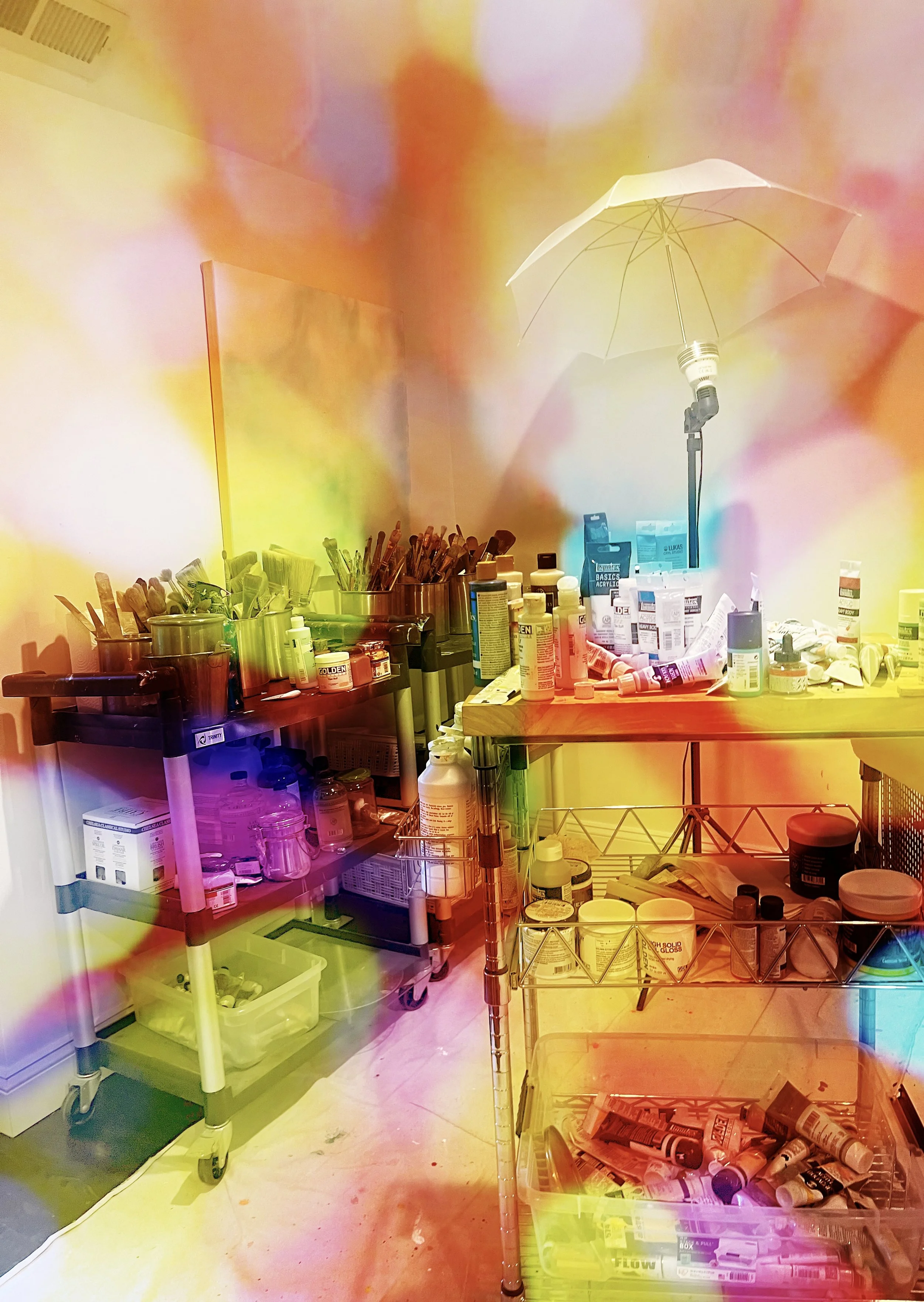 Spirituality and ritual are fundamental for me in ways that are both practical and metaphorical. Essential to this are meditation, music, and establishing a serene, contemplative working environment that will inspire the senses. I work freely, intuitively, and gesturally at first, focusing on surface treatments and fields of color before slowing down to make more considered, specific marks and details. I then create nuanced textures and other effects to enrich the overall range and depth of transparency, ambiguity, vibrancy, and vitality of my compositional forms. I think of this as similar to the different stages of awareness, cognition, drifting, and transcendence related to waking life, dreaming, and meditation. Through my work, I strive to bring art and the essence of existence into tangible confluence, inviting viewers to join me in acts of sensory and aesthetic exploration. I seek to alchemize the challenges of lived reality into visions of beauty. My artwork is an expression and abstraction of life as we live it, an intimation of the depths of our minds and souls, and an emanation of realms of existence far beyond ours.